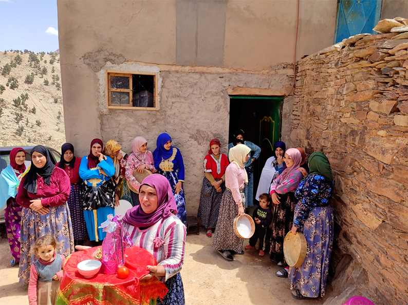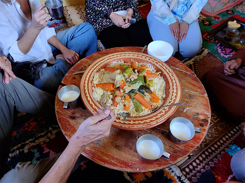 Ad attenderli, donne vestite nei loro abiti colorati, bambini curiosi, uomini sorridenti: tutto il villaggio è presente. La piccola cooperativa femminile non si è limitata a cuocere il pane nel nuovo forno – hanno preparato un pasto completo, ricco di sapori e profumi della montagna, piatti che farebbero bella figura anche in un ristorante rinomato a Rabat. Couscous fragrante, tajine speziate, verdure dell’orto e tè alla menta servito con la solennità dei giorni importanti.