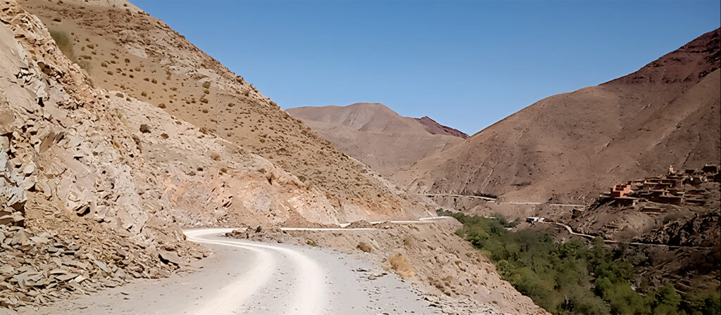 La mattina dopo, Alessandro, Arianna, Alberico e Maria Sole partono di buon’ora da Marrakech. I chilometri da percorrere non sono molti, ma l’80% della strada è tutta curve, e l’ultimo tratto è una vera e propria sfida: l’asfalto sparisce, lasciando il posto a una pista di sassi e polvere che si arrampica lungo le pareti di un canyon. In fondo, tra gole scavate dal tempo, scorre un piccolo fiume che dà la vita a questo microcosmo isolato dal mondo.